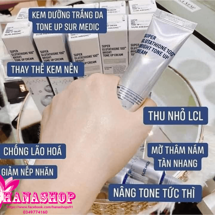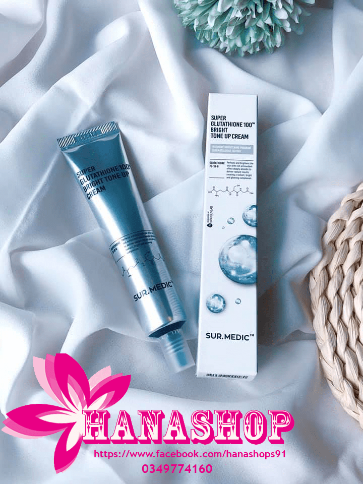 - Kem dưỡng Sur.Medic Super Glutathione 100 Bright Tone Up Cream siêu đậm đặc với khả năng dưỡng trắng gấp đôi nhanh chóng giúp da trắng sáng, đều màu da.